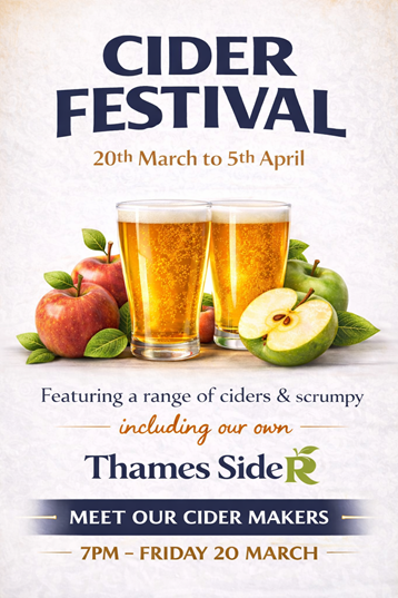 The Thames Side Brewery Cider Festival runs from 20th March to 5th April.