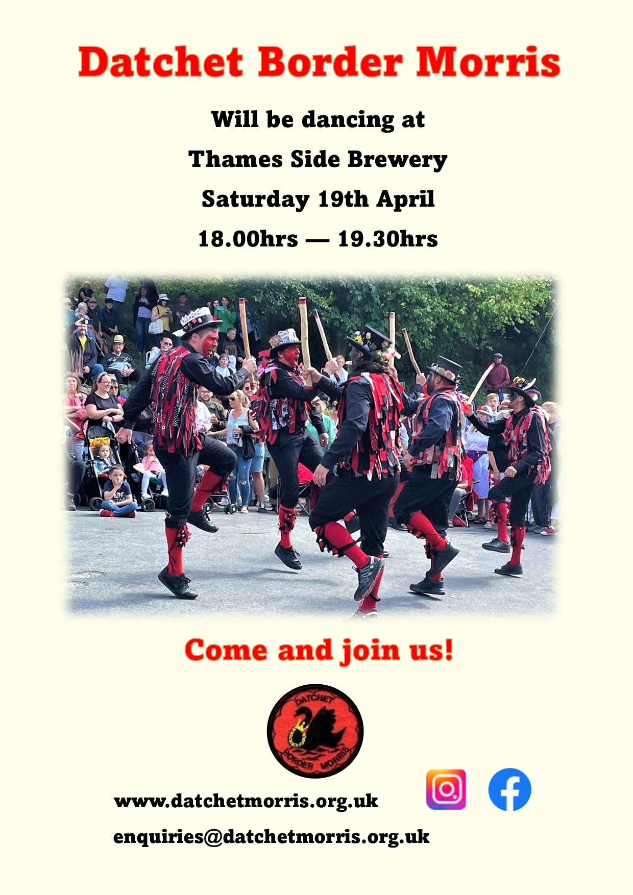 Free Entry In celebration of the start of Spring we welcome Datchet Morris who will perform a variety of traditional dances to encourage the fertility of the fruit trees and eventually the apples that give us cider.