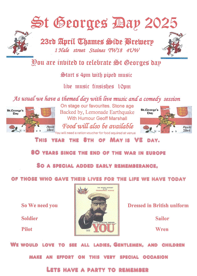 St Georges Day 2025 You are invited to celebrate St Georges Day. Starts at 4pm with piped music. Live Music finishes at 10pm As usual, we have a themed day with live music and a comedy session. On stage our favourites - Stone Age, backed by Lemonade Earthquate with humour Geoff Marshall. Food will also […]